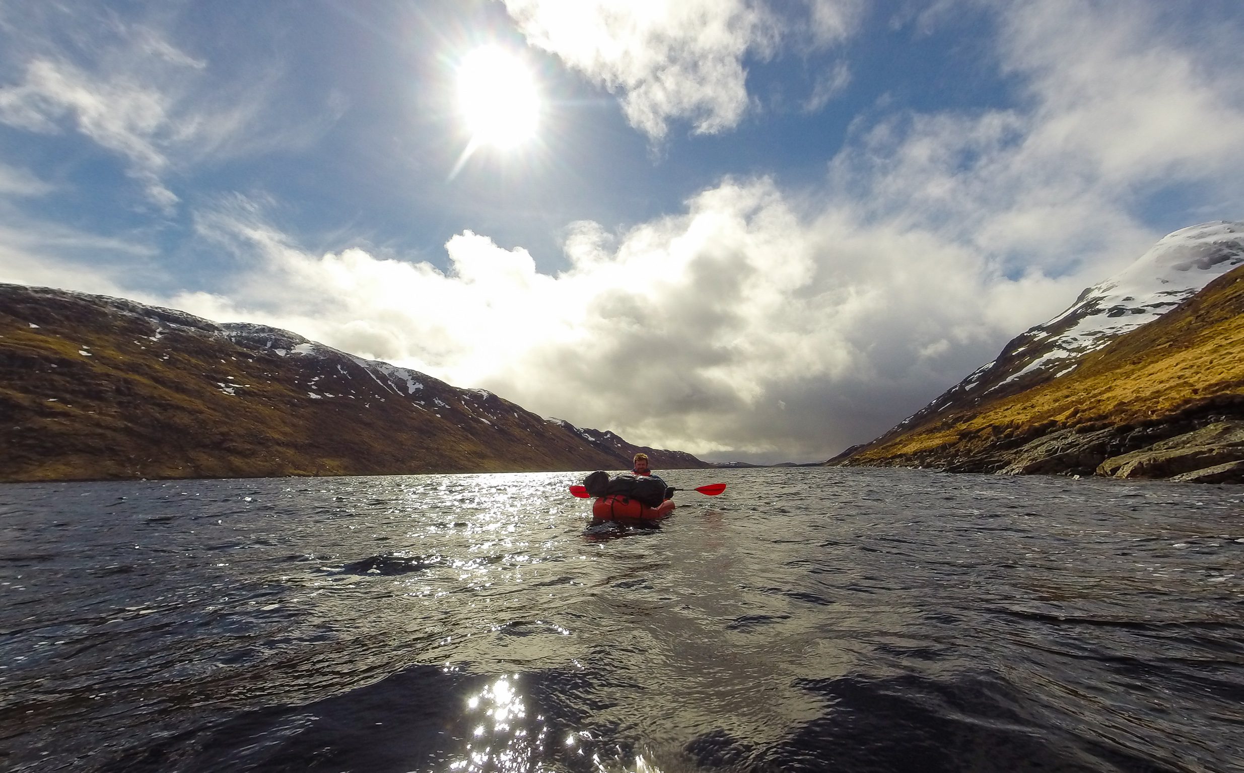 It felt a lot better to have the packs on the rafts rather than on our backs and breaking up the journey like this is one of the great things about packrafting. The wind was in the right direction to blow us up Loch Ericht, there was no one else to be seen and we even got some sunshine on occasion.