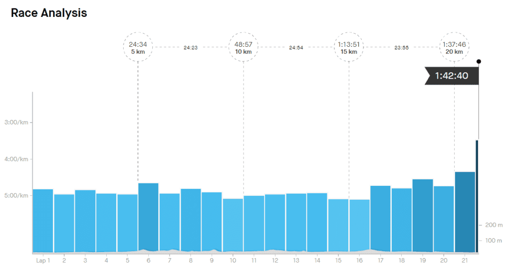 After 40min I was in uncharted territory but still feeling good. Had a gel at around 50min and no gut issues at all. The last 9km or so was out and back so could see runners returning on the other side of the road, very motivating to see these people close to finishing and moving fast. I had a caffeine bullet around this time as well which tasted pretty bad but gave me something else to think about and didn’t give me any issues.